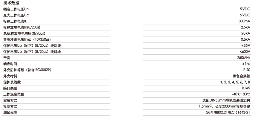 依據(jù)IEC標(biāo)準(zhǔn)設(shè)計(jì),采取專用RJ45插頭座,能在最短的時(shí)間(ps級(jí))內(nèi)。將浪涌限制在一定的電壓保護(hù)水平,降低各接線間的電位差,使接入網(wǎng)絡(luò)通信端口的電子電路免受雷電、瞬態(tài)高壓浪涌的危害。