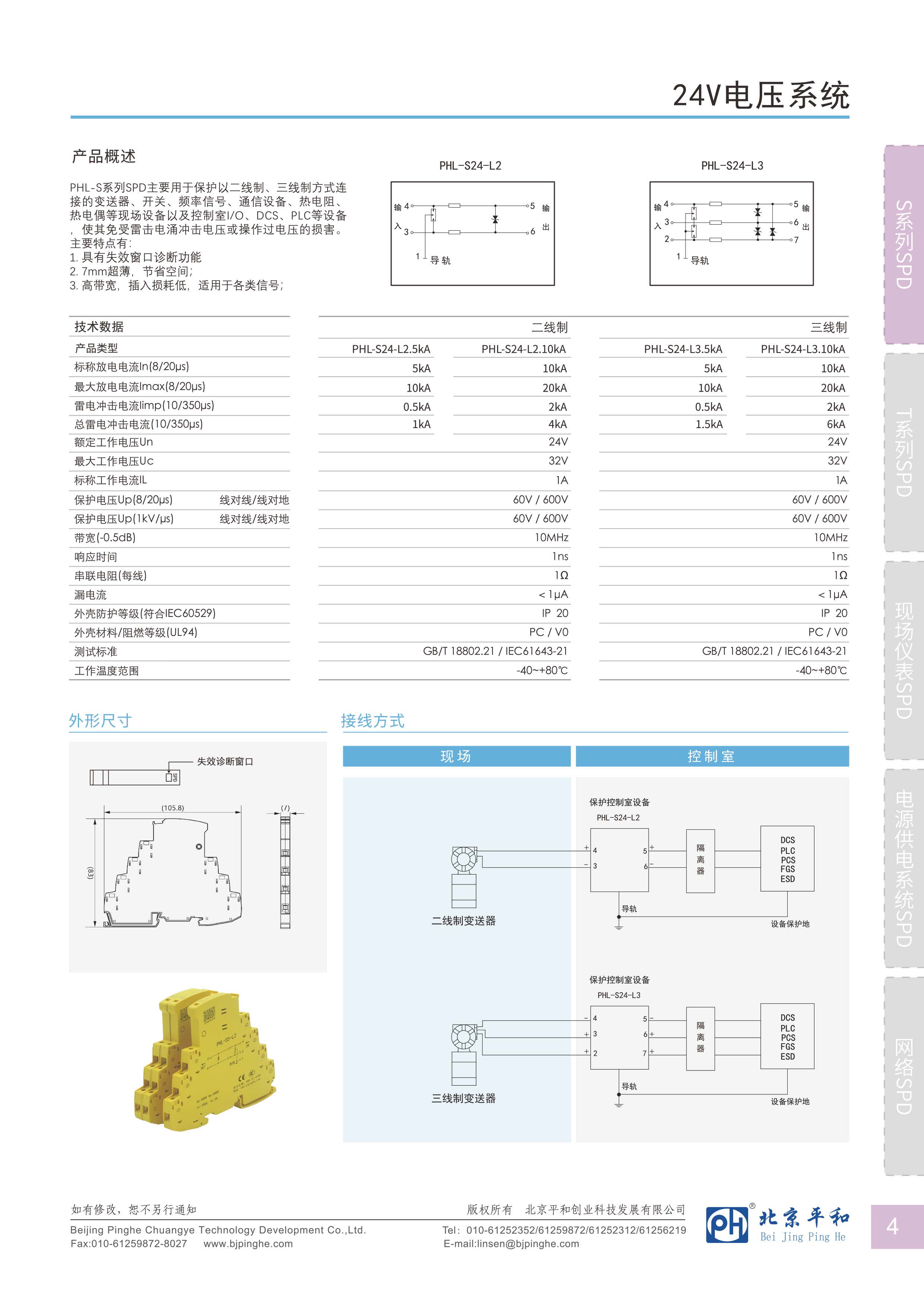 PHL-S系列SPD主要用于保護以二線制、三線制方式連接的變送器、開關、頻率信號、通信設備、熱電阻、熱電偶等現(xiàn)場設備以及控制室I/O、DCS、PLC等設備,使其免受雷擊電涌沖擊電壓或操作過電壓的損害。主要特點有: