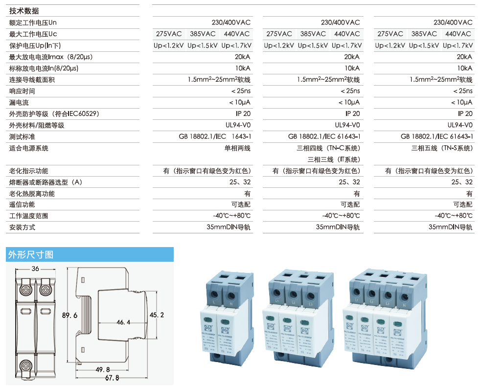 用第三級(jí)的電源浪涌保護(hù)器,適合安裝在各類供電電源的終端配電箱,以及其他LPZ2區(qū)與LPZ3區(qū)和后續(xù)分區(qū)的交界處。