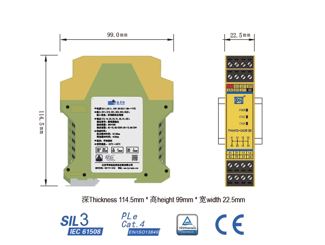 PH6402-2A2B(M)是一款安全繼電器控制模塊,適用于安全地毯輸入,具有2路常開(NO)安全輸出觸點(diǎn)和2路常閉(NC)輔助輸出觸點(diǎn)的安全繼電器。它支持雙通道操作,手動復(fù)位,并具有復(fù)位按鈕監(jiān)控功能。