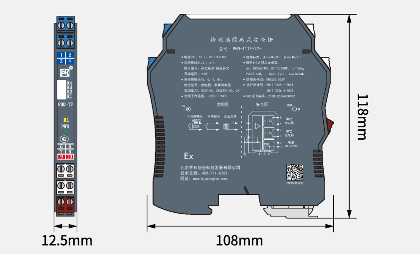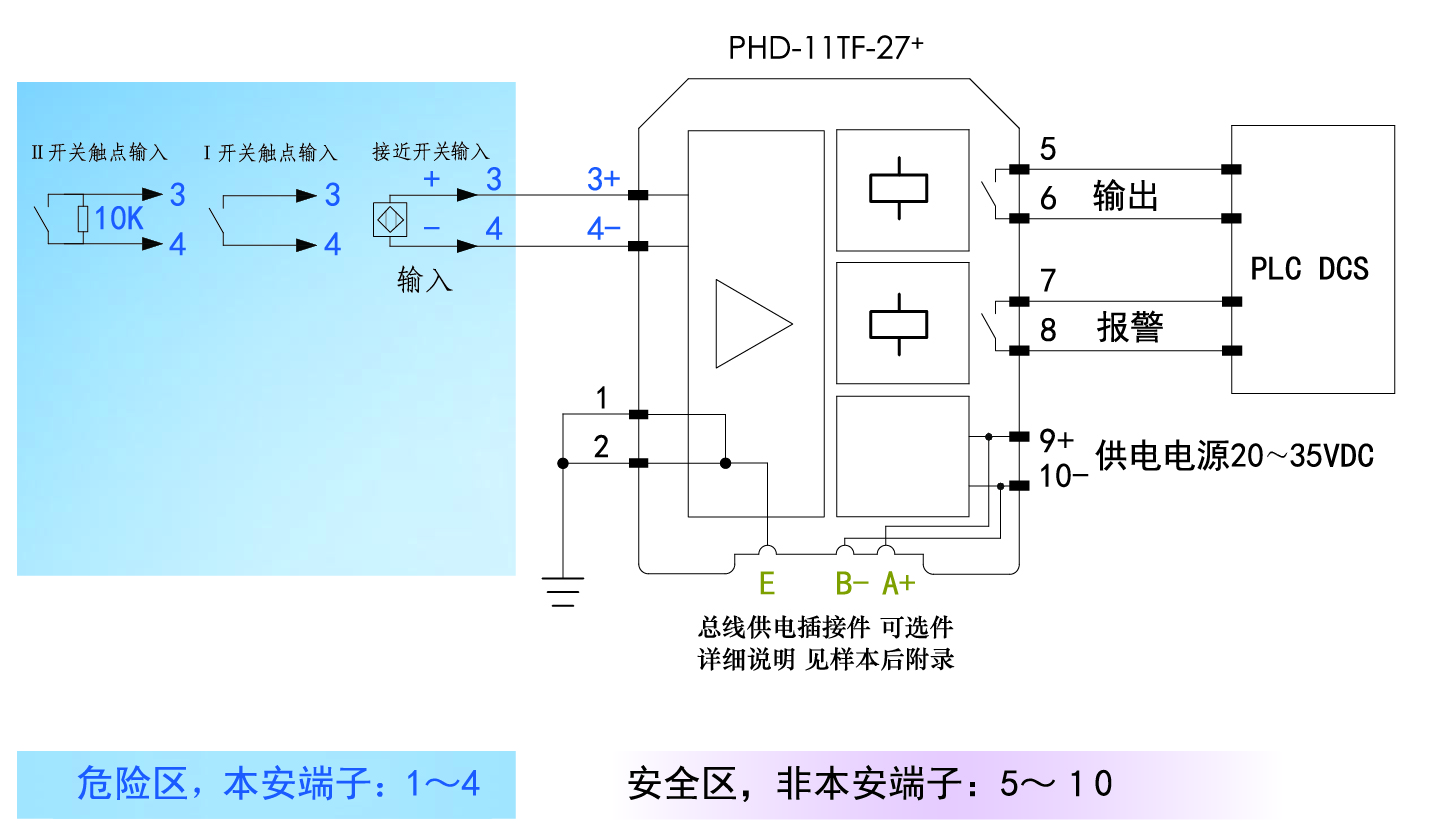 電涌保護型開關量輸入繼電器輸出隔離柵,將來自危險區(qū)的開關觸點或接近開關的輸入信號,傳輸?shù)桨踩珔^(qū)繼電器輸出。線路故障檢測通過單獨的繼電器輸出,并在模塊頂部LED燈顯示。模塊的撥碼開關用來設置輸入和輸出同相或反相控制,以及設置開啟或關閉線路故障檢測報警指示功能。