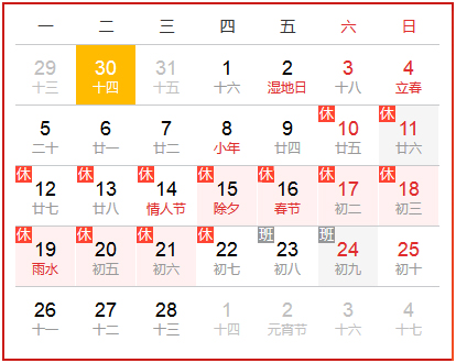 2018年2月10日至2018年2月22日放假,共13天;2月23日(周五)、2月24日(周六)正常上班;放假期間,我們將會暫停發(fā)貨等人工服務。 如果在此期間您有貨物發(fā)送安排,請?zhí)崆芭c平和客服經(jīng)理聯(lián)系。
