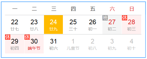 5月27日(周六)上班;5月31日(周三)上班起正常上班。