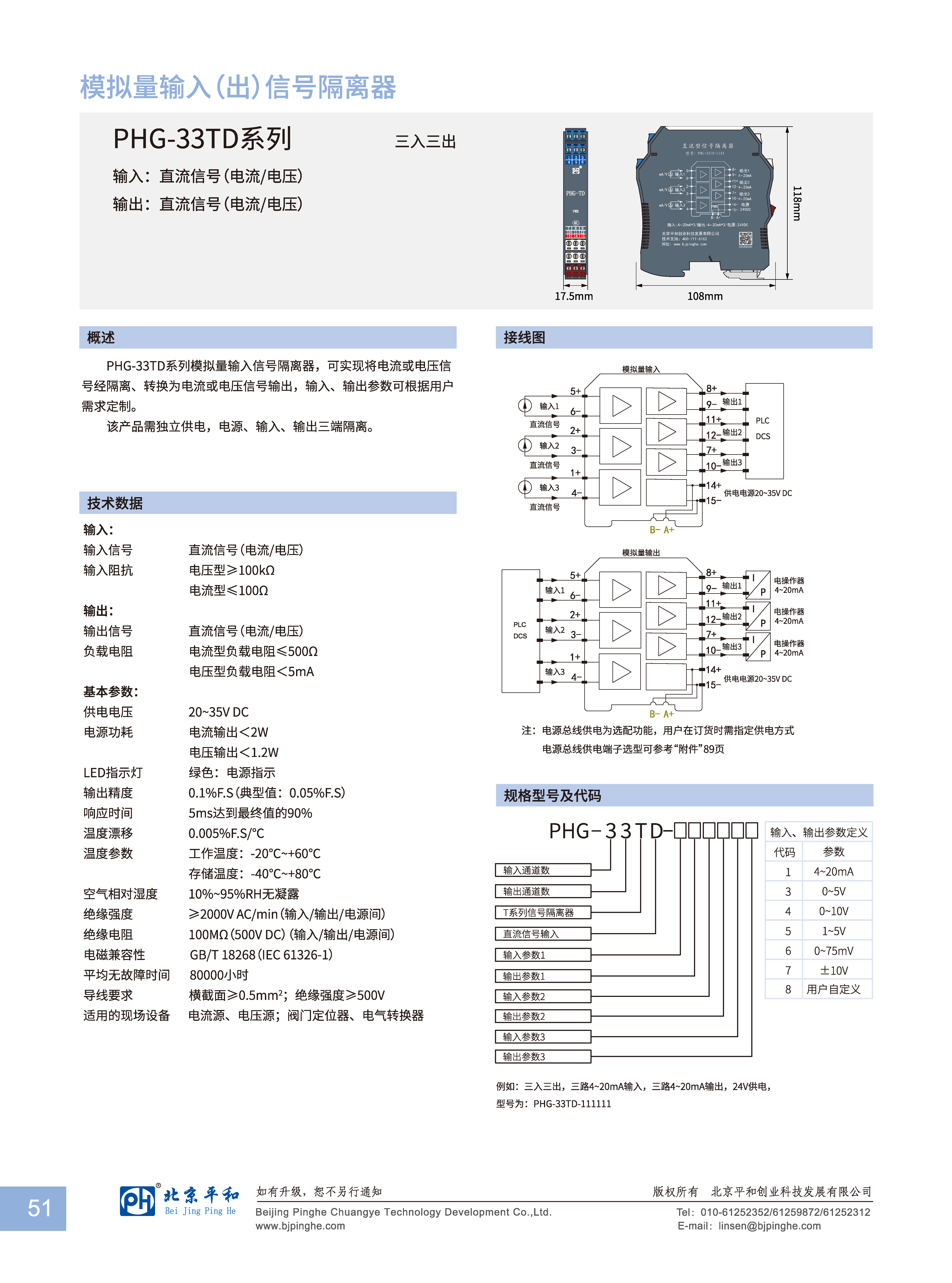 PHG-33TD系列模擬量輸入信號(hào)隔離器,可實(shí)現(xiàn)將電流或電壓信號(hào)經(jīng)隔離、轉(zhuǎn)換為電流或電壓信號(hào)輸出,輸入、輸出參數(shù)可根據(jù)用戶需求定制。