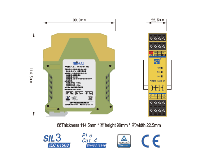 PH6203-2A2B-NP是一款安全繼電器控制模塊,適用于NPN、PNP型安全光幕輸入,具有2路常開(NO)安全輸出觸點(diǎn)和2路常閉(NC)輔助輸出觸點(diǎn)的安全繼電器。它支持雙通道操作,可選擇手動(dòng)或自動(dòng)復(fù)位。