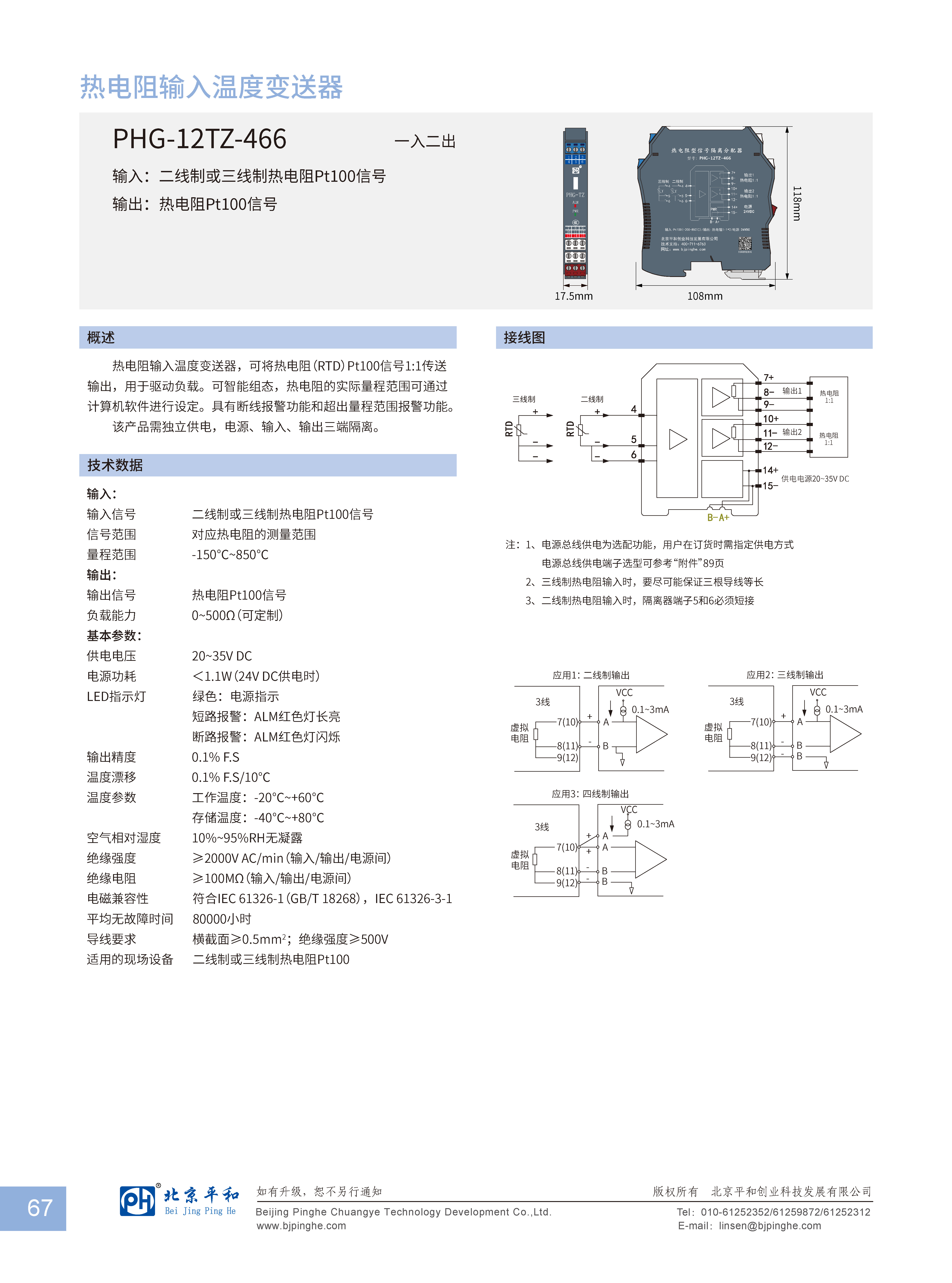 熱電阻輸入溫度變送器,可將熱電阻(RTD) Pt100信號1:1傳送輸出,用于驅動負載。可智能組態(tài),熱電阻的實際量程范圍可通過計算機軟件進行設定。具有斷線報警功能和超出量程范圍報警功能。