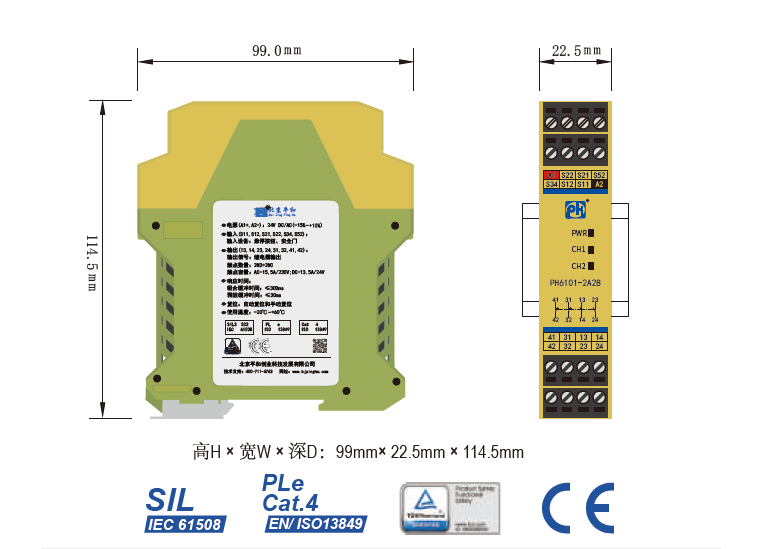 PH6101-2A2B是一款安全繼電器控制模塊,適用于急停按鈕、安全門(mén)控制開(kāi)關(guān)輸入,具有2路常開(kāi)(NO)安全輸出觸點(diǎn)和2路常閉(NC)輔助輸出觸點(diǎn)的安全繼電器。它支持單、雙通道操作,手動(dòng)或自動(dòng)復(fù)位,并具有通道間短路監(jiān)控功能。