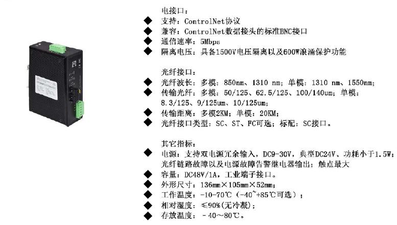 支持:ControlNet協(xié)議 兼容:ControlNet數(shù)據(jù)接頭的標準BNC接口 通信速率:5Mbps 隔離電壓:具備1500V電壓隔離以及600W浪涌保護功能 |