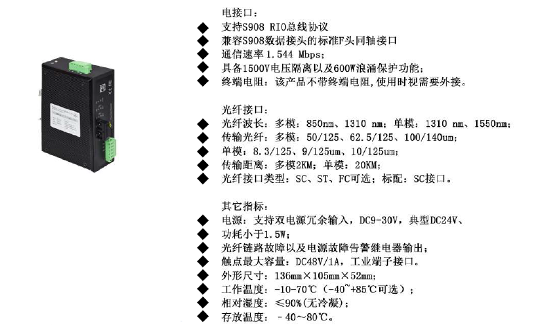 *支持S908 RIO工業(yè)控制現(xiàn)場總線協(xié)議。通信速率1.544M自適應(yīng)。*光纖最遠(yuǎn)通信距離可達(dá)6OKM。