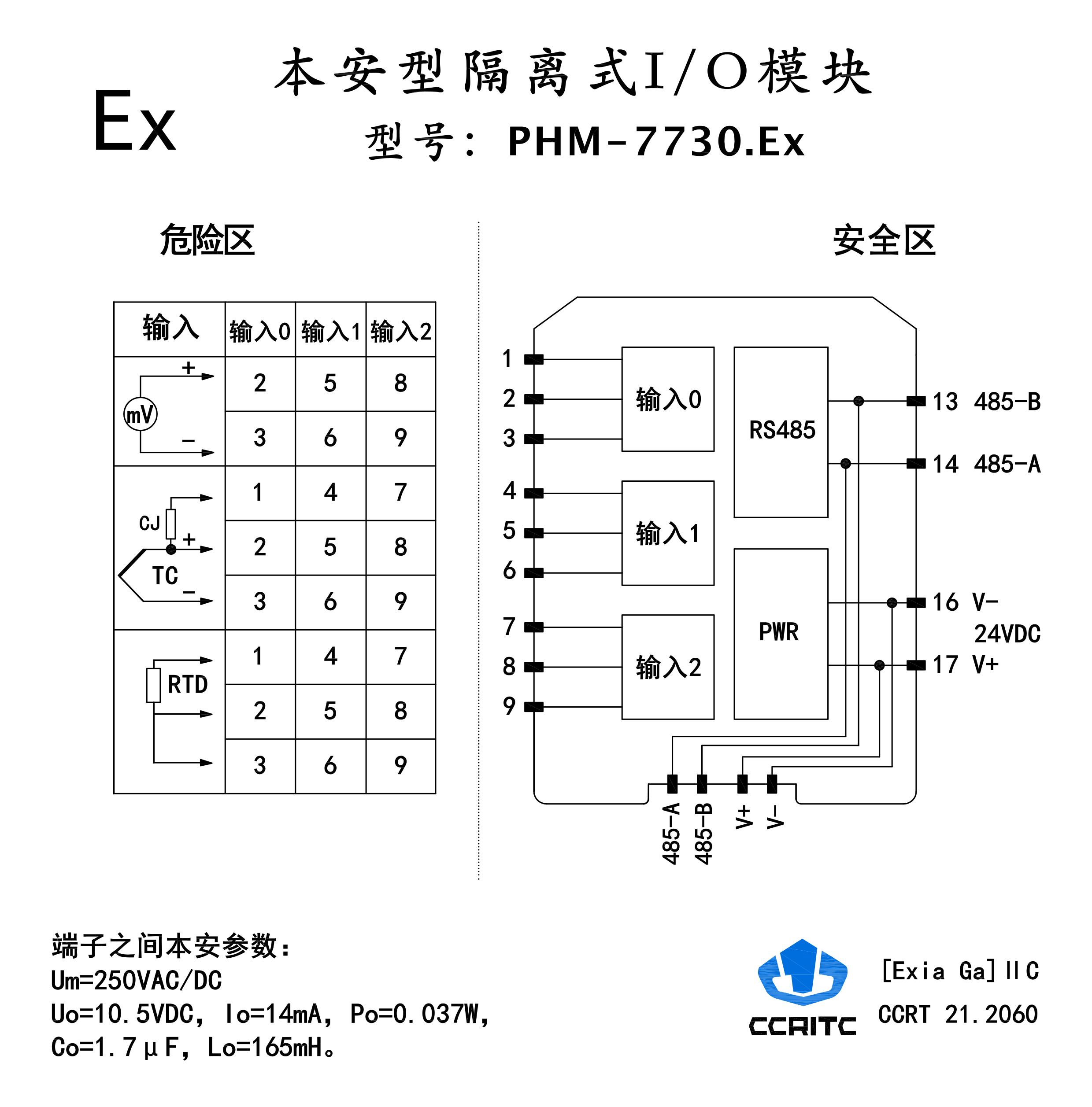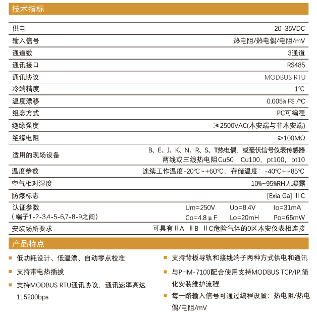 將工業(yè)現(xiàn)場(chǎng)危險(xiǎn)區(qū)的3路溫度信號(hào)隔離轉(zhuǎn)換為數(shù)字信號(hào),按照MODBUS RTU通訊協(xié)議。通過RS485通訊方式,將數(shù)字信號(hào)提供給PHM-7100、PLC或上位機(jī)系統(tǒng)。