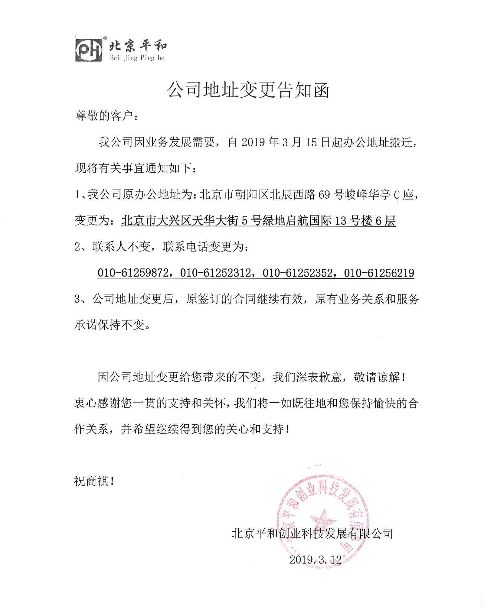 北京平和公司地址變更告知函