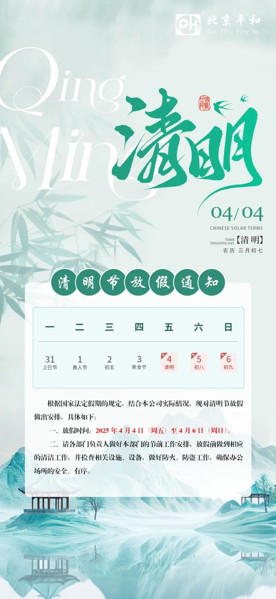 發(fā)布人:北京平和市場部 發(fā)布時間:2025-04-03 關鍵詞:北京平和 清明節(jié) 放假通知
