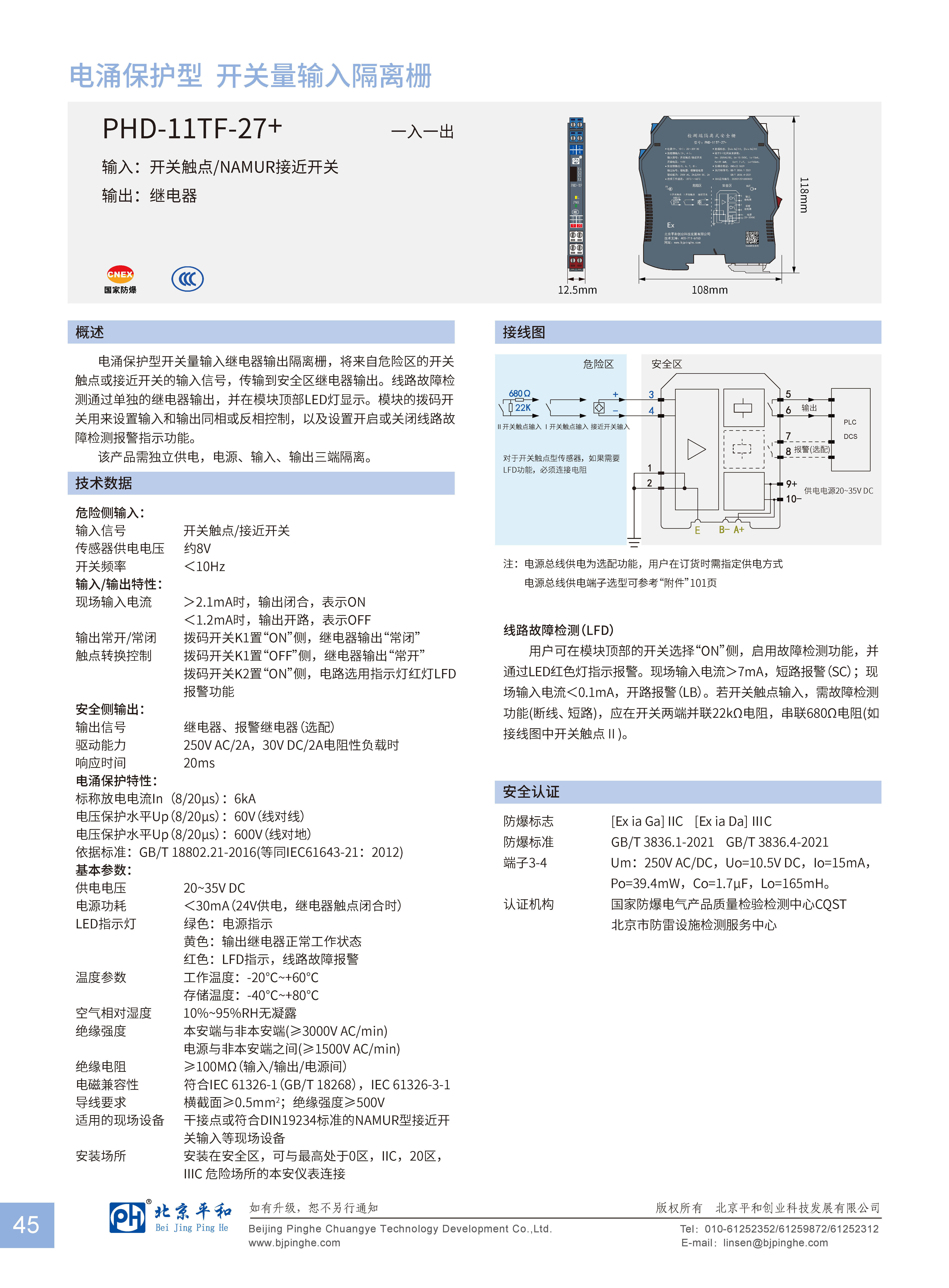 電涌保護型開關量輸入繼電器輸出隔離柵,將來自危險區(qū)的開關觸點或接近開關的輸入信號,傳輸?shù)桨踩珔^(qū)繼電器輸出。線路故障檢測通過單獨的繼電器輸出,并在模塊頂部LED燈顯示。模塊的撥碼開關用來設置輸入和輸出同相或反相控制,以及設置開啟或關閉線路故障檢測報警指示功能。