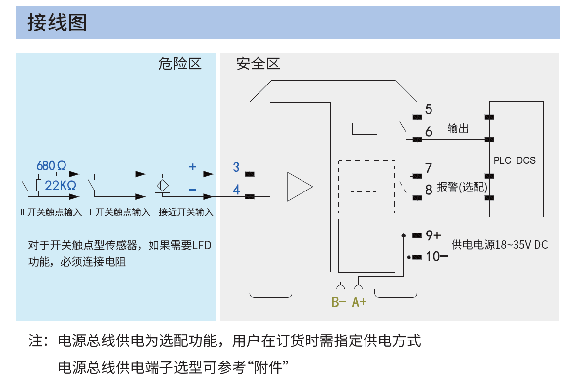 用戶可在模塊頂部的開關(guān)選擇“ON”側(cè), 啟用故障檢測功能, 并通過LED紅色燈指示報警。現(xiàn)場輸入電流>7mA, 短路報警 (SC); 現(xiàn)場輸入電流<0.1mA, 開路報警(LB)。諾開關(guān)觸點輸入, 需斷線檢測功能(斷線,短路),應(yīng)在開關(guān)兩端并聯(lián)22KΩ電阻, 串聯(lián)680Ω電阻 (如下圖接線圖中開關(guān)觸點 II)。 |