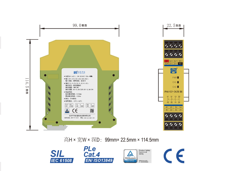 PH6102-2A2B(M)是一款安全繼電器控制模塊,適用于急停按鈕、安全門控制開關(guān)輸入,具有2路常開(NO)安全輸出觸點(diǎn)和2路常閉(NC)輔助輸出觸點(diǎn)的安全繼電器。它支持單、雙通道操作,手動(dòng)復(fù)位,并具有通道間短路監(jiān)控功能。