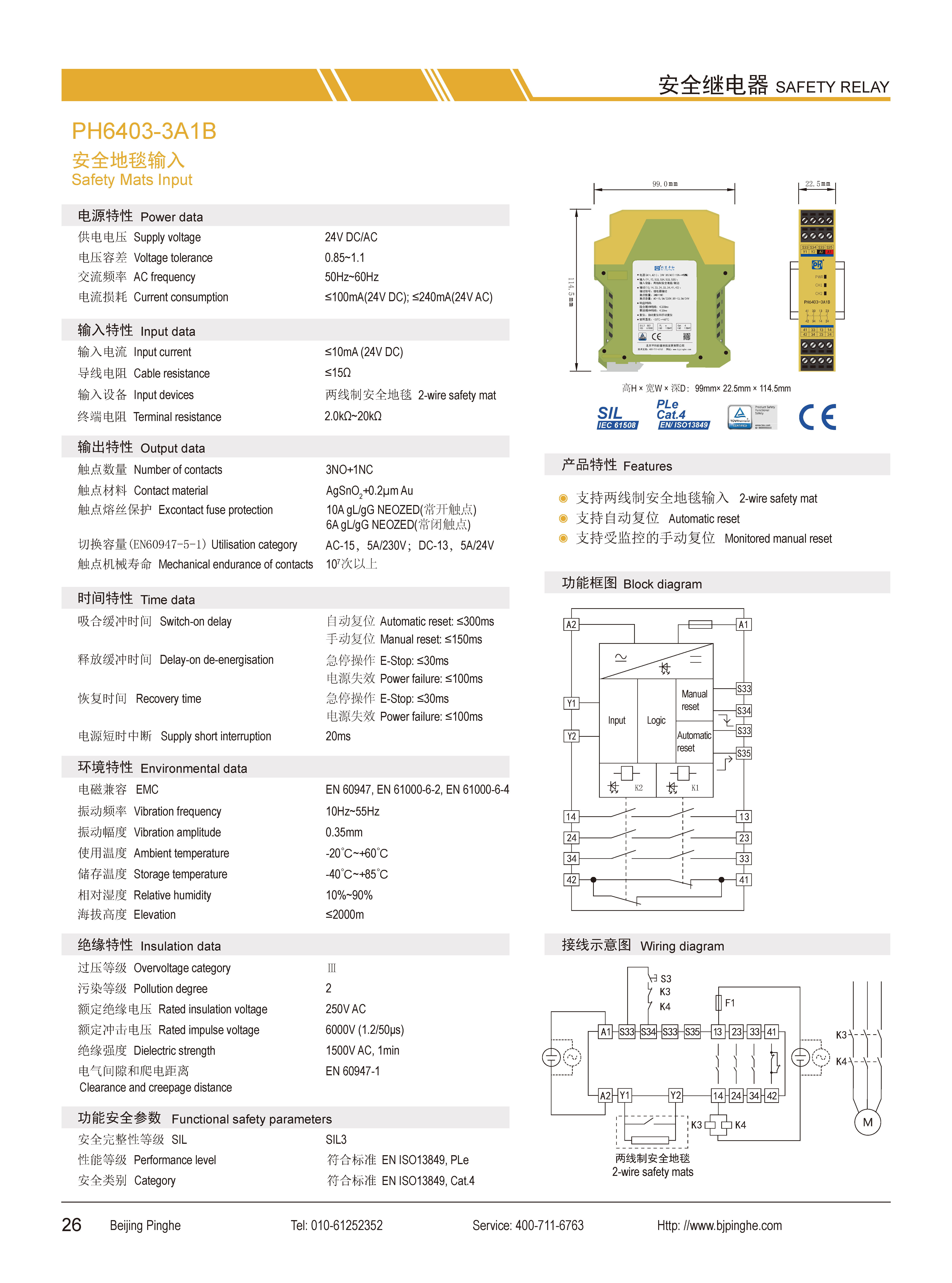 PH6403-3A1B是一款安全繼電器控制模塊,適用于兩線制安全地毯輸入,具有3路常開(NO)安全輸出觸點(diǎn)和1路常閉(NC)輔助輸出觸點(diǎn)的安全繼電器。它支持手動(dòng)或自動(dòng)復(fù)位,并具有復(fù)位按鈕監(jiān)控功能。